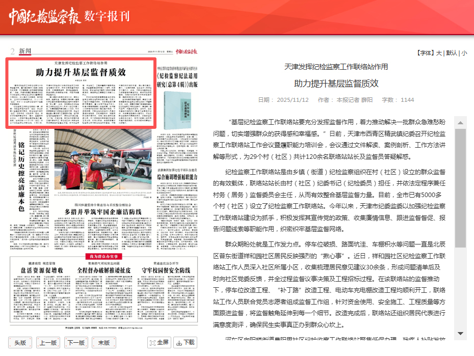 纪检监察工作联络站是由乡镇(街道)纪检监察组织在村(社区)设立的群众监督的有效载体,联络站站长由村(社区)纪委书记(纪检委员)担任,并依法定程序兼任村务(居务)监督委员会主任,从而有效整合基层监督力量。目前,全市已有5000多个村(社区)设立了纪检监察工作联络站。今年以来,天津市纪委监委以加强纪检监察工作联络站建设为抓手,积极发挥其宣传党的政策、收集廉情信息、跟进监督督促、报告问题线索等职能作用,织密织牢基层监督网络。
